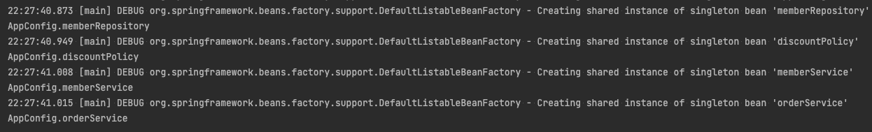 하지만 막상 아래의 테스트 코드를 돌려 보면, 싱글톤이 보장된다는 것을 알 수 있다. 그리고 콘솔창을 확인하면, memberRepository() 메서드는 한 번만 호출되었다는 것을 확인할 수 있다.